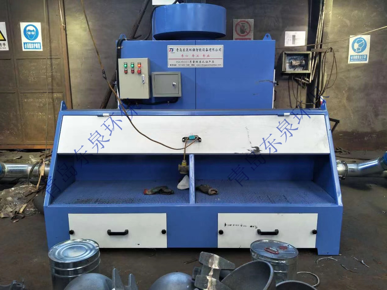 本設(shè)備在風(fēng)機的作用下,含塵氣體從除塵器正面的迷宮式進風(fēng)窗進入除塵器箱體。粉塵通過迷宮窗慣性碰撞除塵,大顆粒粉塵被碰撞分離,火星被熄滅,粉塵進入第二級濾筒高 效過濾段,含塵氣體由濾筒外表面穿過濾芯,粉塵則被濾芯阻攔在其表面,當(dāng)被阻攔的粉塵在濾芯表面不斷沉積時,當(dāng)壓差達(dá)到設(shè)定值時,壓差傳感器發(fā)出指令,通過脈沖噴吹對濾筒進行逐個清灰,使得沉積在濾芯表面上的粉塵顆粒在壓縮空氣的沖擊下,脫離濾芯表面落入集塵抽屜中,使得整個濾芯表面都得到清潔,凈化后的空氣經(jīng)風(fēng)機排出。