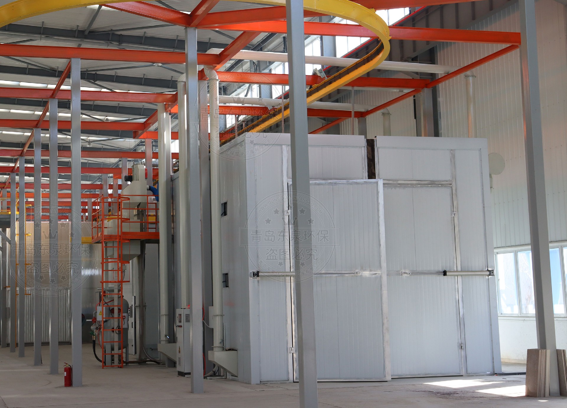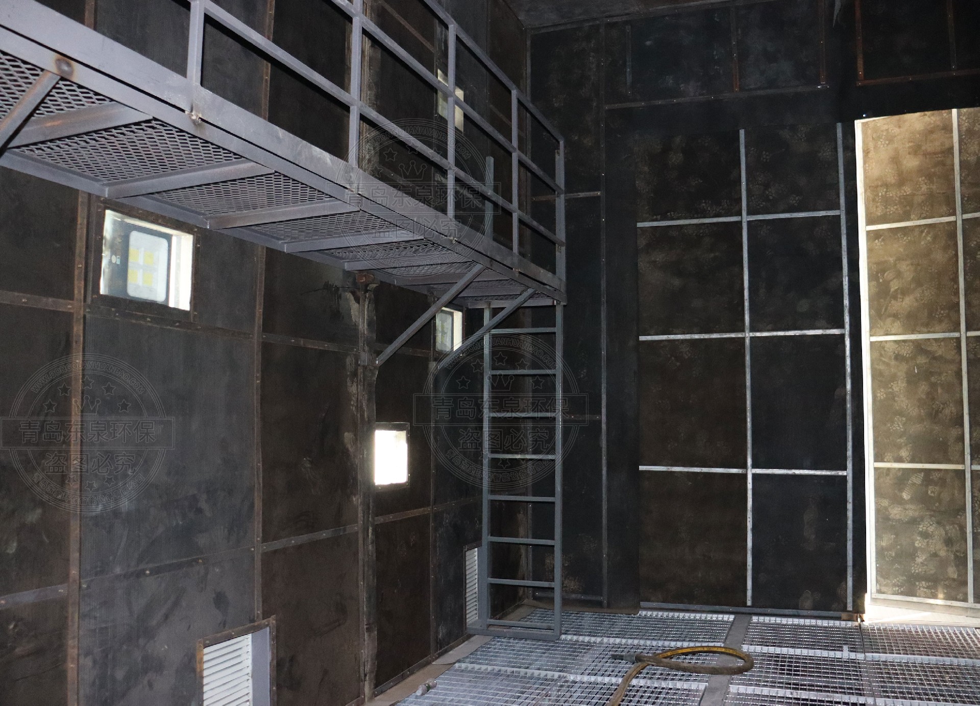 5)采用型鋼做室體框架,外面覆蓋50mm厚彩鋼夾芯板。室體內(nèi)部滿鋪1.5mm鋼板,減少鋼丸沖擊及損壞;內(nèi)襯3mm耐磨橡膠板,防止丸料對(duì)板壁的沖擊磨損,噴砂室兩端開(kāi)門(mén)。在噴砂室體兩側(cè)各配置1個(gè)工作安全門(mén),便于操作人員調(diào)整噴砂主機(jī)和對(duì)設(shè)備進(jìn)行檢修及出現(xiàn)故障時(shí)安全撤離。在噴砂室側(cè)壁和大門(mén)上配置透明觀察窗。