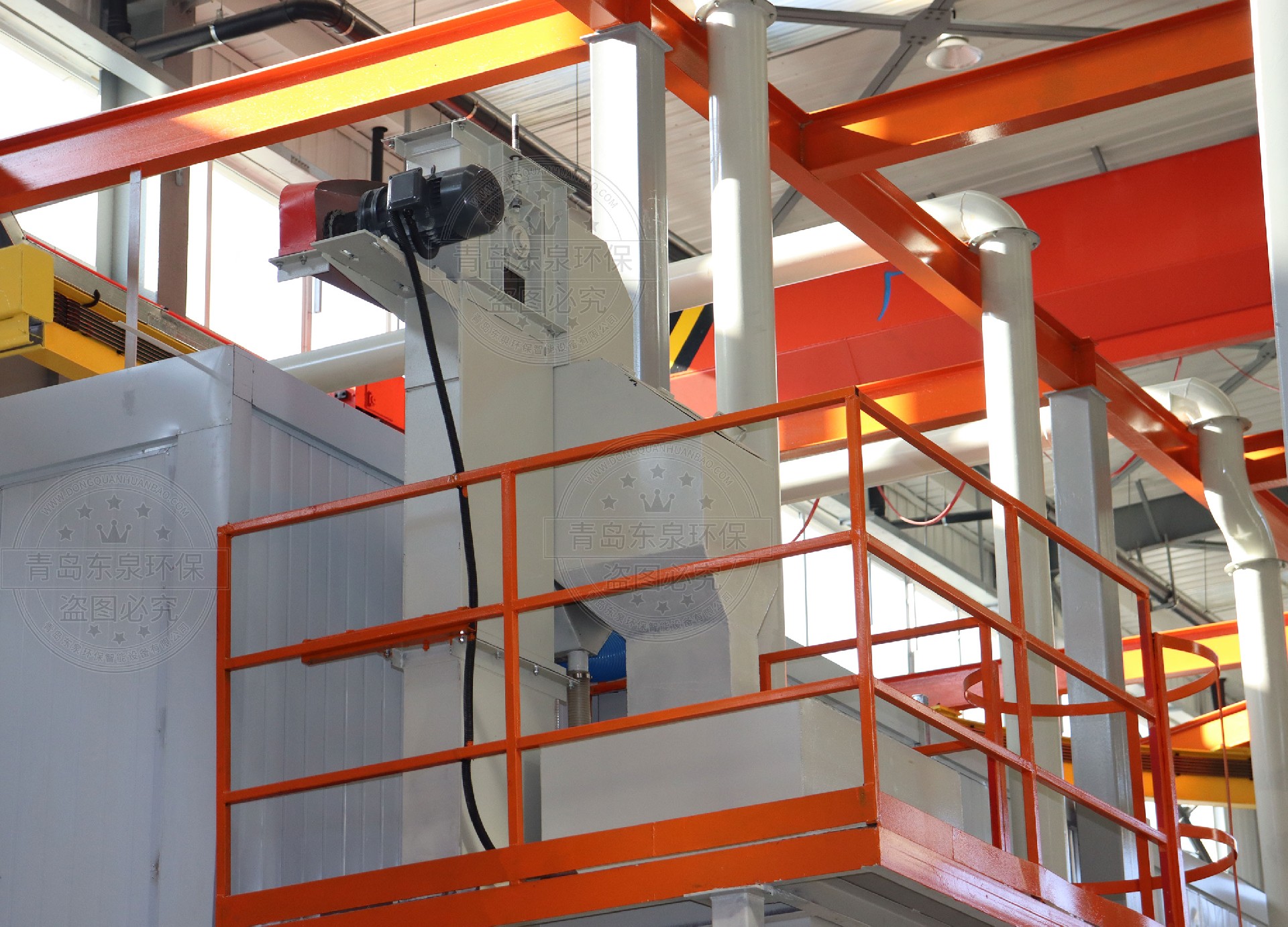 6)回砂采用三組氣動(dòng)刮板回砂方式,外形簡(jiǎn)潔美觀,節(jié)省設(shè)備的占地面積,無(wú)需大量基建,回砂量大,檢修方便,在回收到皮帶輸送機(jī)后,經(jīng)過(guò)分離進(jìn)入儲(chǔ)料斗,最終進(jìn)入噴砂罐,輸送系統(tǒng)采用柔性設(shè)計(jì),減少對(duì)鋼砂的擠壓,機(jī)械輸送造成的快速磨損等。